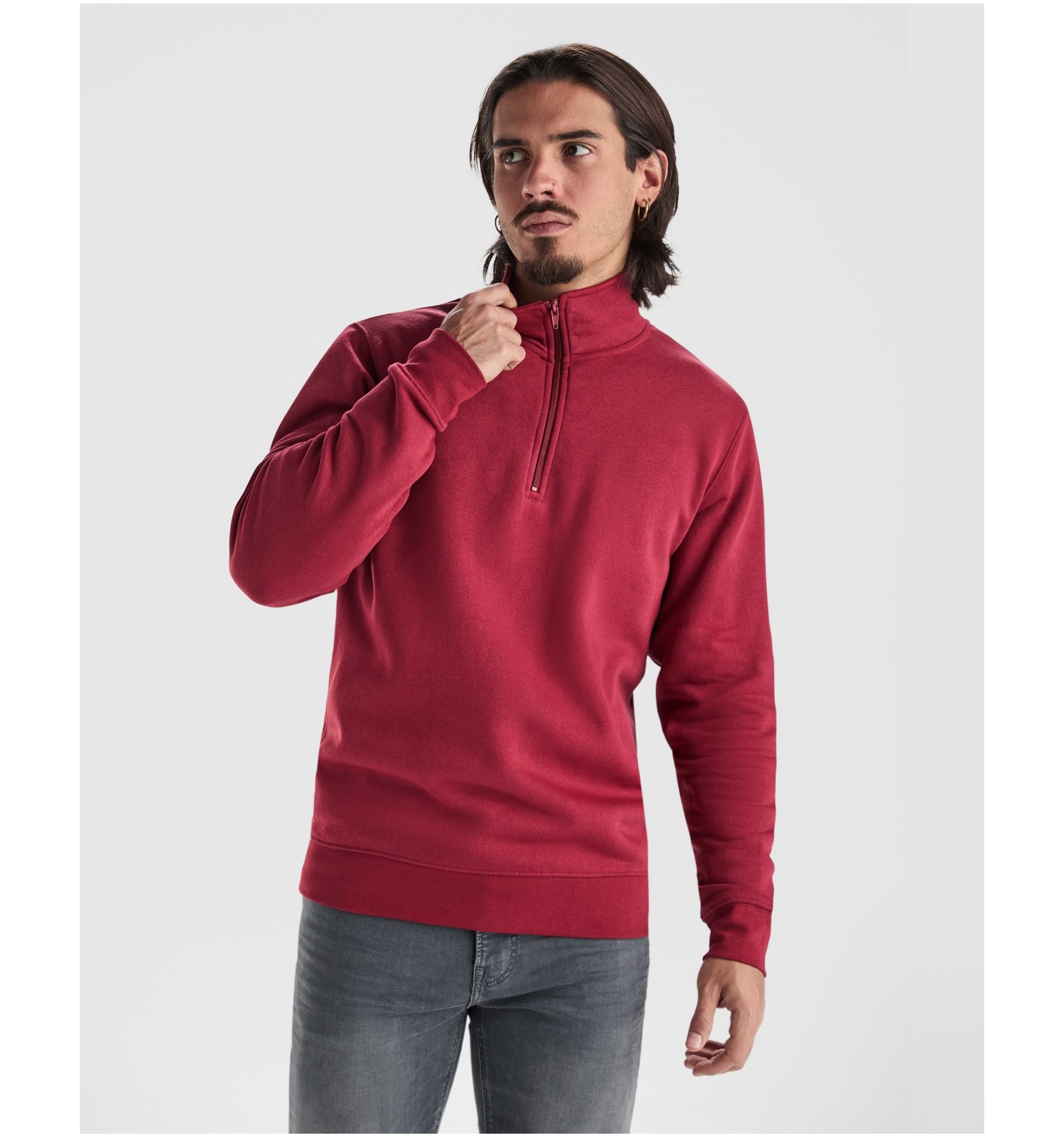 Hanorac cu fermoar la gât de aceeași culoare și guler înalt. Interior guler de aceeași culoare. Bandă întărită pentru acoperirea cusăturii pe interior la guler. Punct în canalé 1x1 la manșete și în talie.