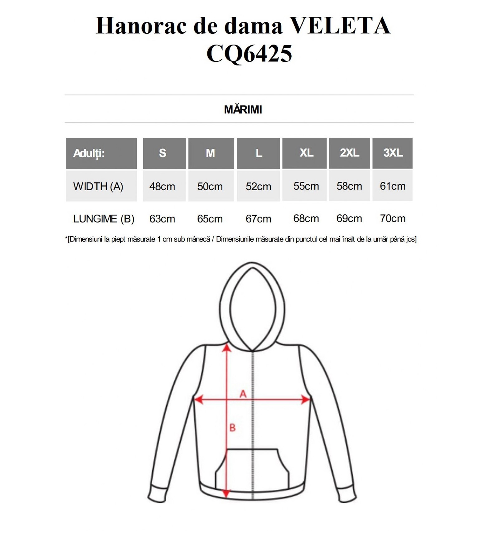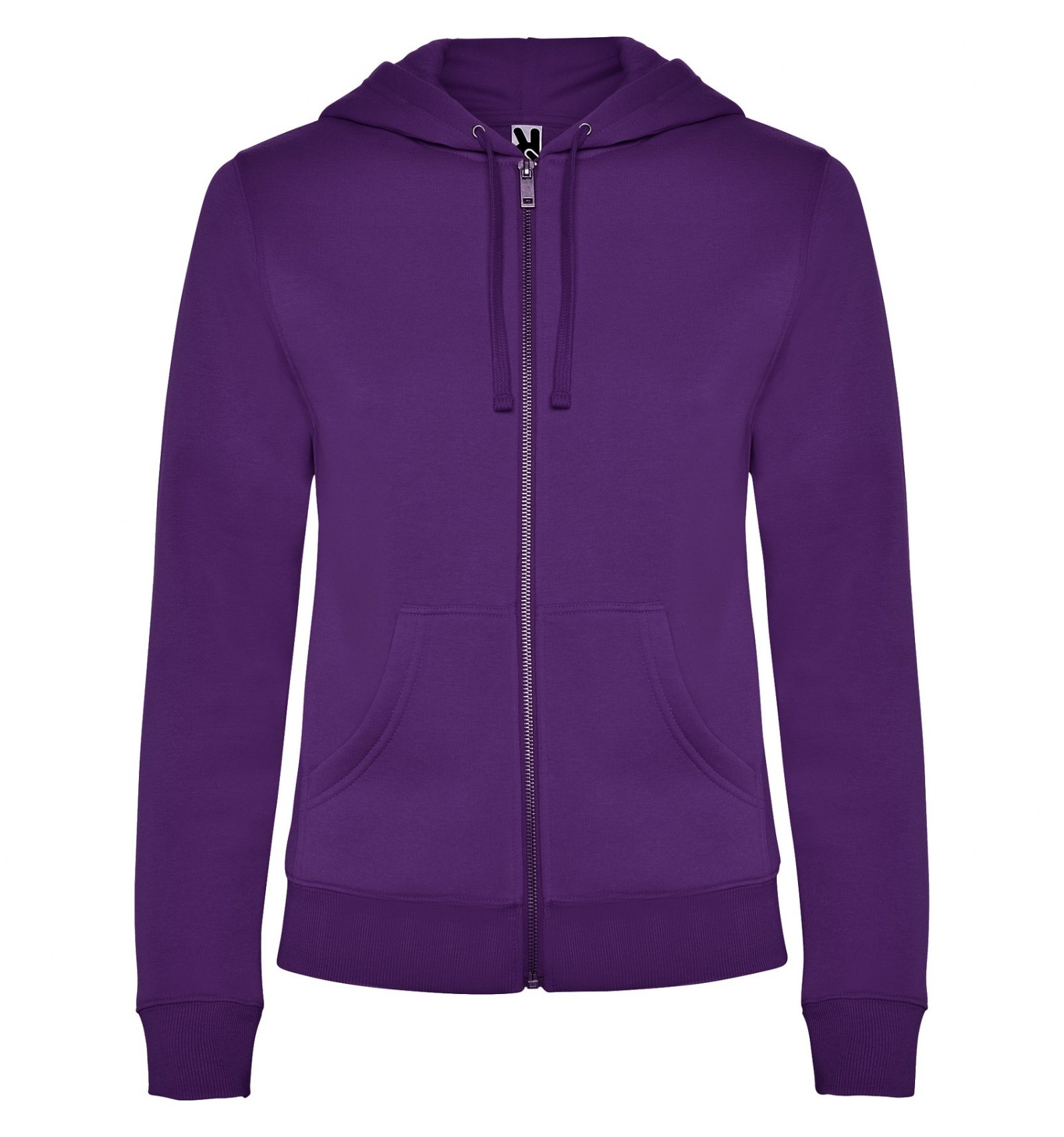 Hanorac de damă cu glugă căptușită. Fermoar metalic în față și buzunar tip marsupiu. Bandă întărită pentru acoperirea cusăturilor la gât. Talie și manșete în punct canalé 2x2. Model cambrat.