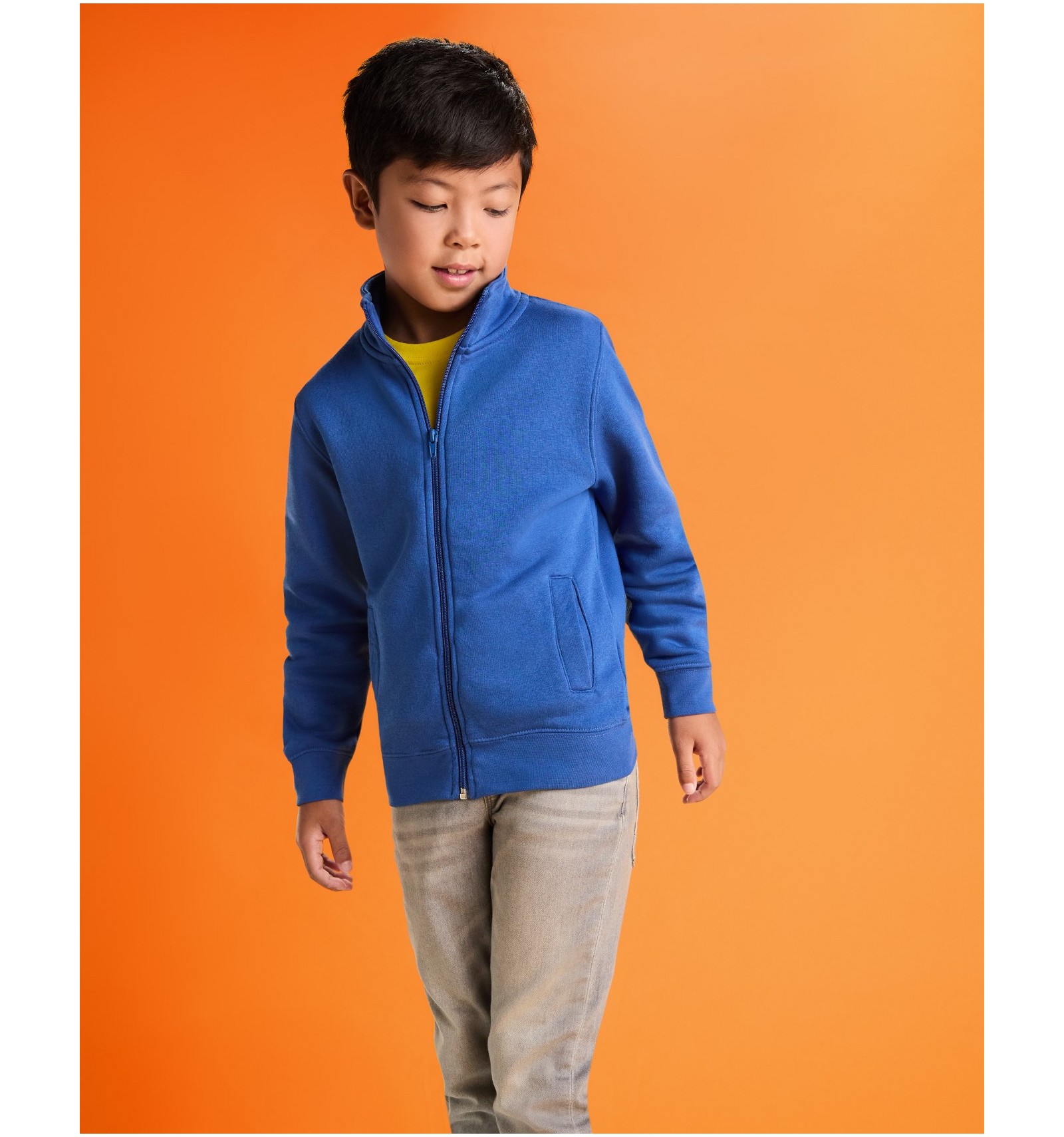 Hanorac cu guler înalt și fermoar la gât de aceeași culoare. Interior guler de aceeași culoare. Bandă întărită pentru acoperirea cusăturii pe interior la guler. Punct canalé 1x1 la manșete și în talie.