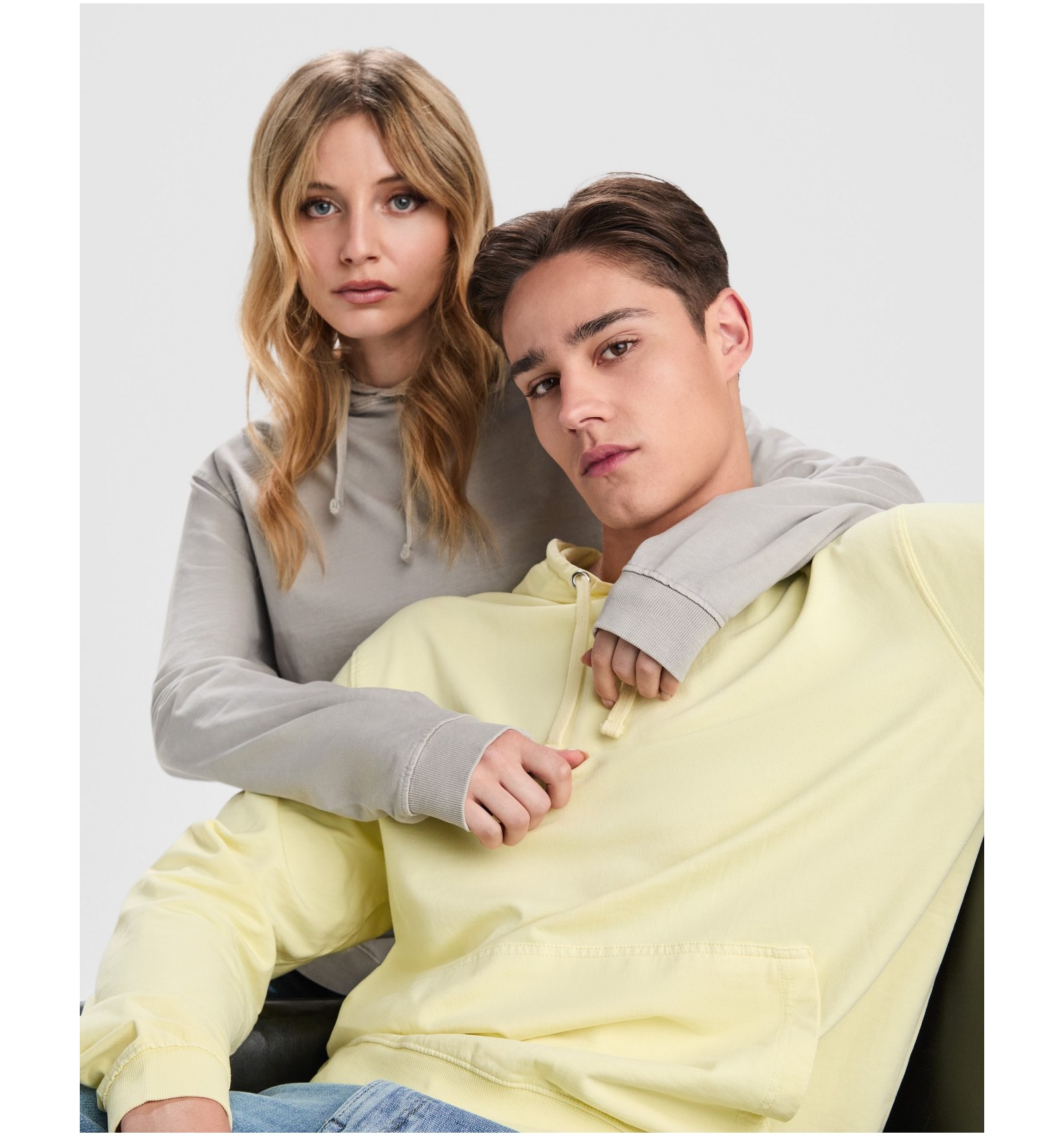 Hanorac unisex cu glugă, din bumbac nevătuit, cu efect decolorat. Buzunar tip cangur.