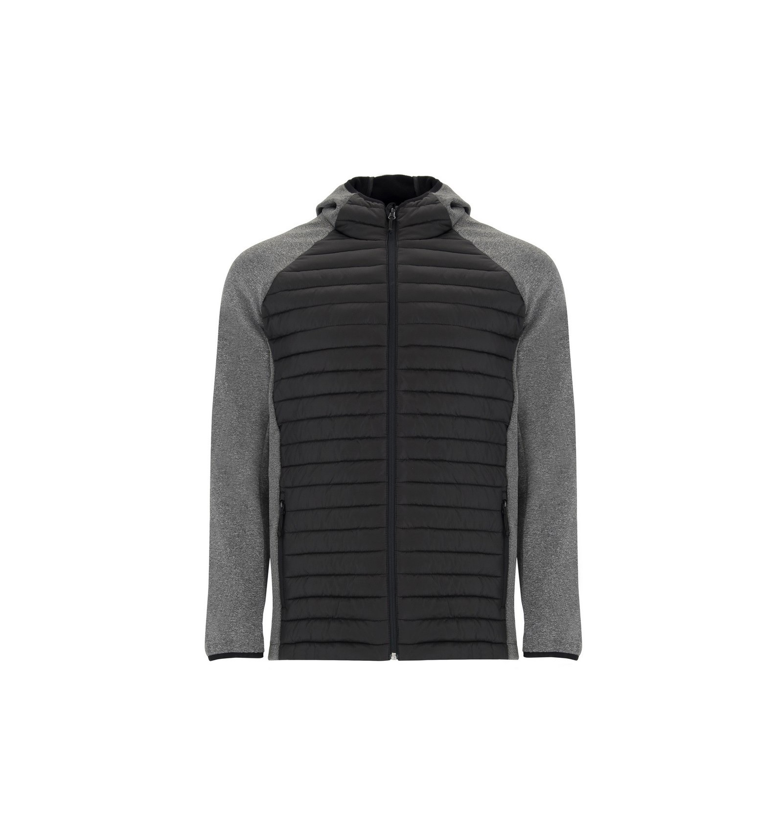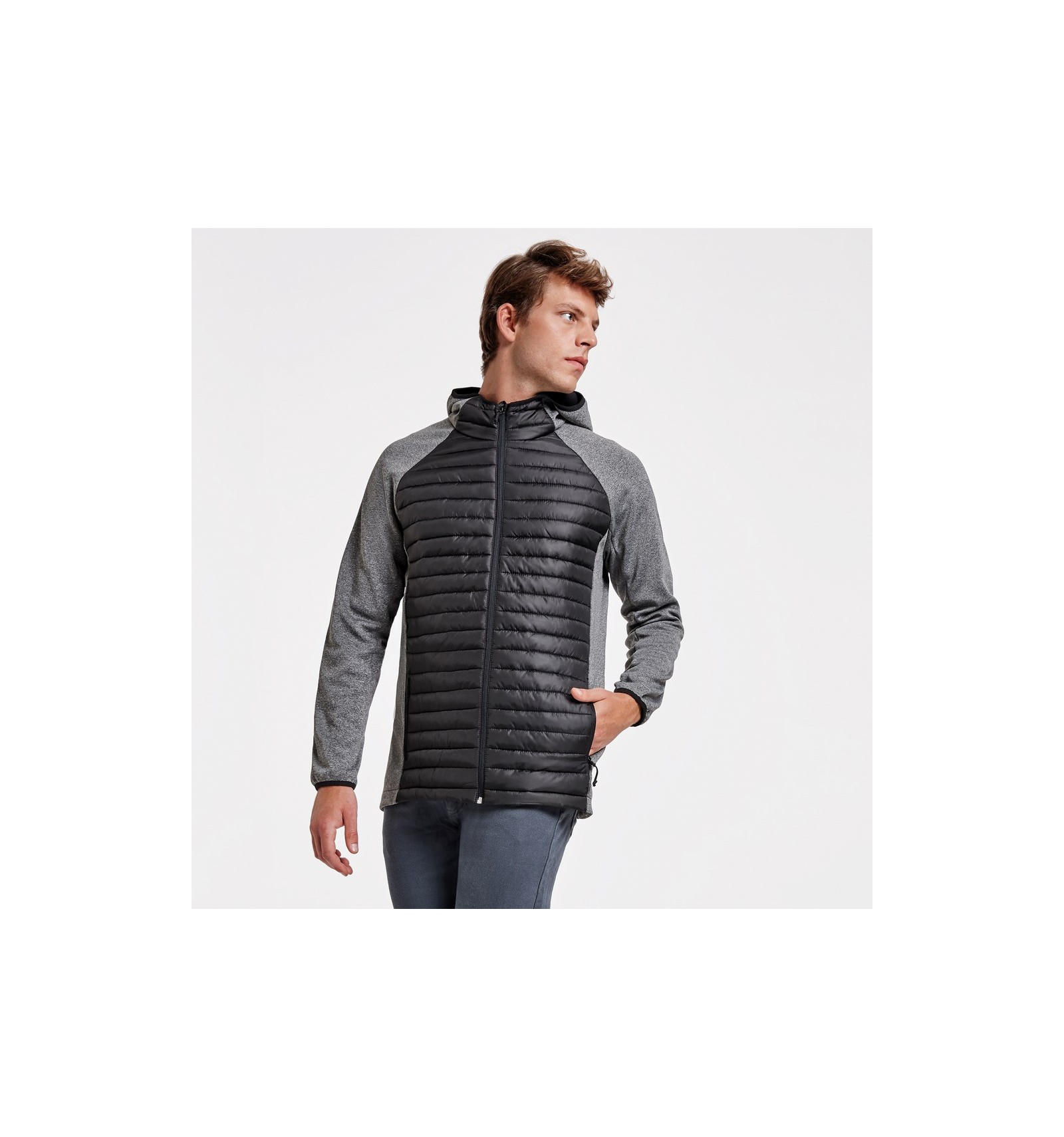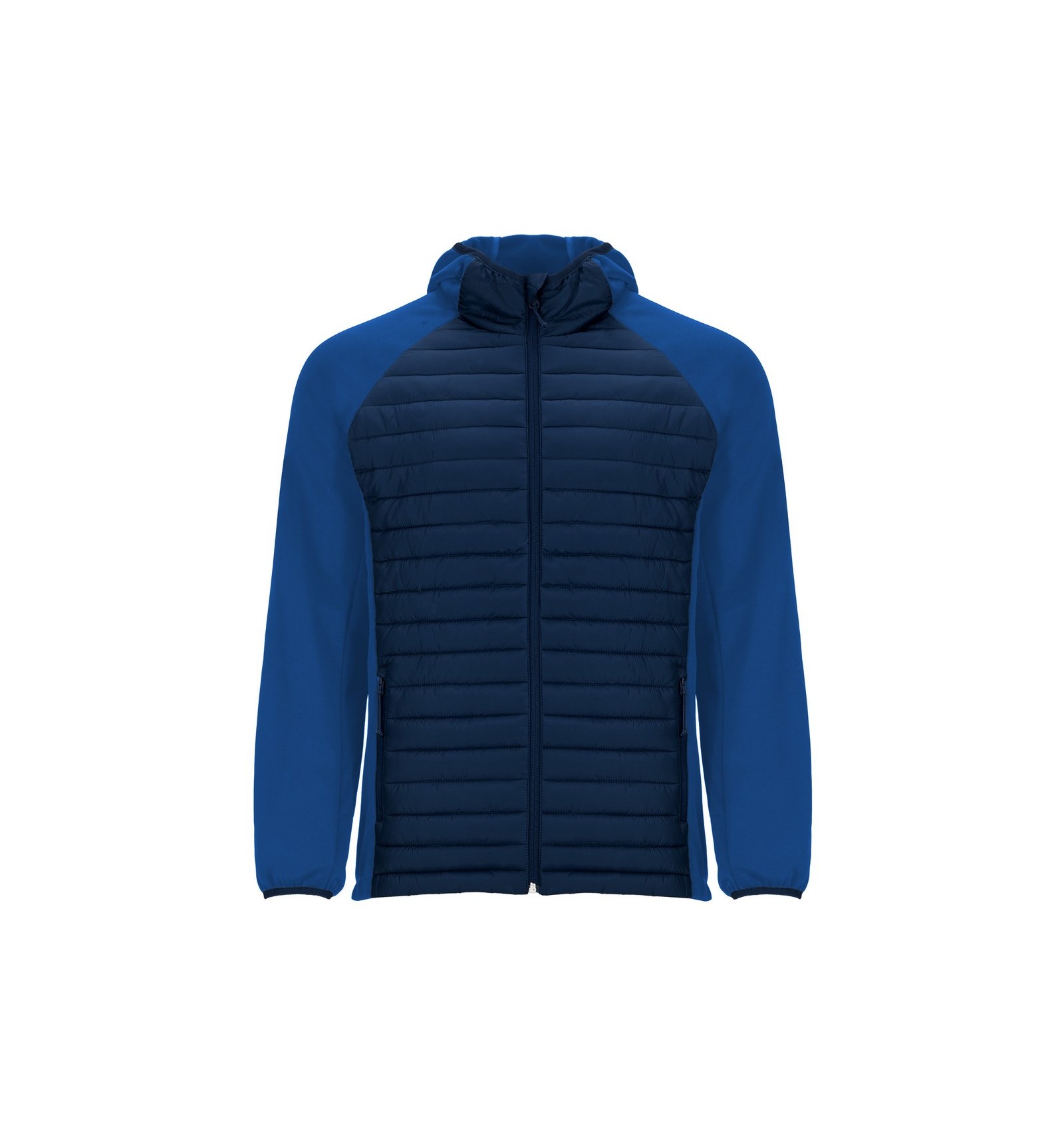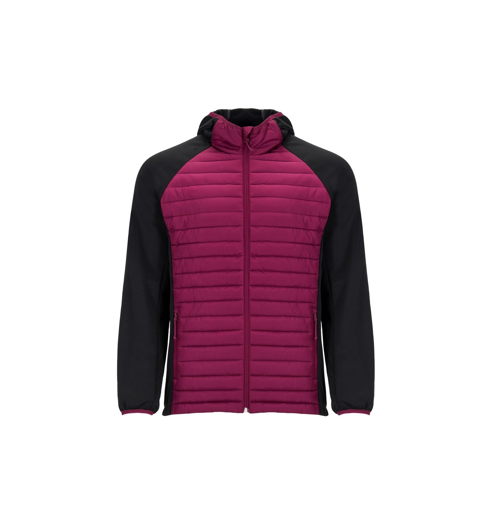 Jachetă de bărbați confecționată din două tipuri de material: 1. Glugă fixă. 2. Mânecă raglan. 3. Mânecile, panelele laterale și gluga din softshell. 4. Partea din față și din spate matlasate cu umplutură tact pene. 5. Fermoar inversat cu protecție pentru bărbie și cheiță. 6. Două buzunare în față, cu fermoar. 7. Margine elastică de aceeași culoare la guler, manșete și în talie.