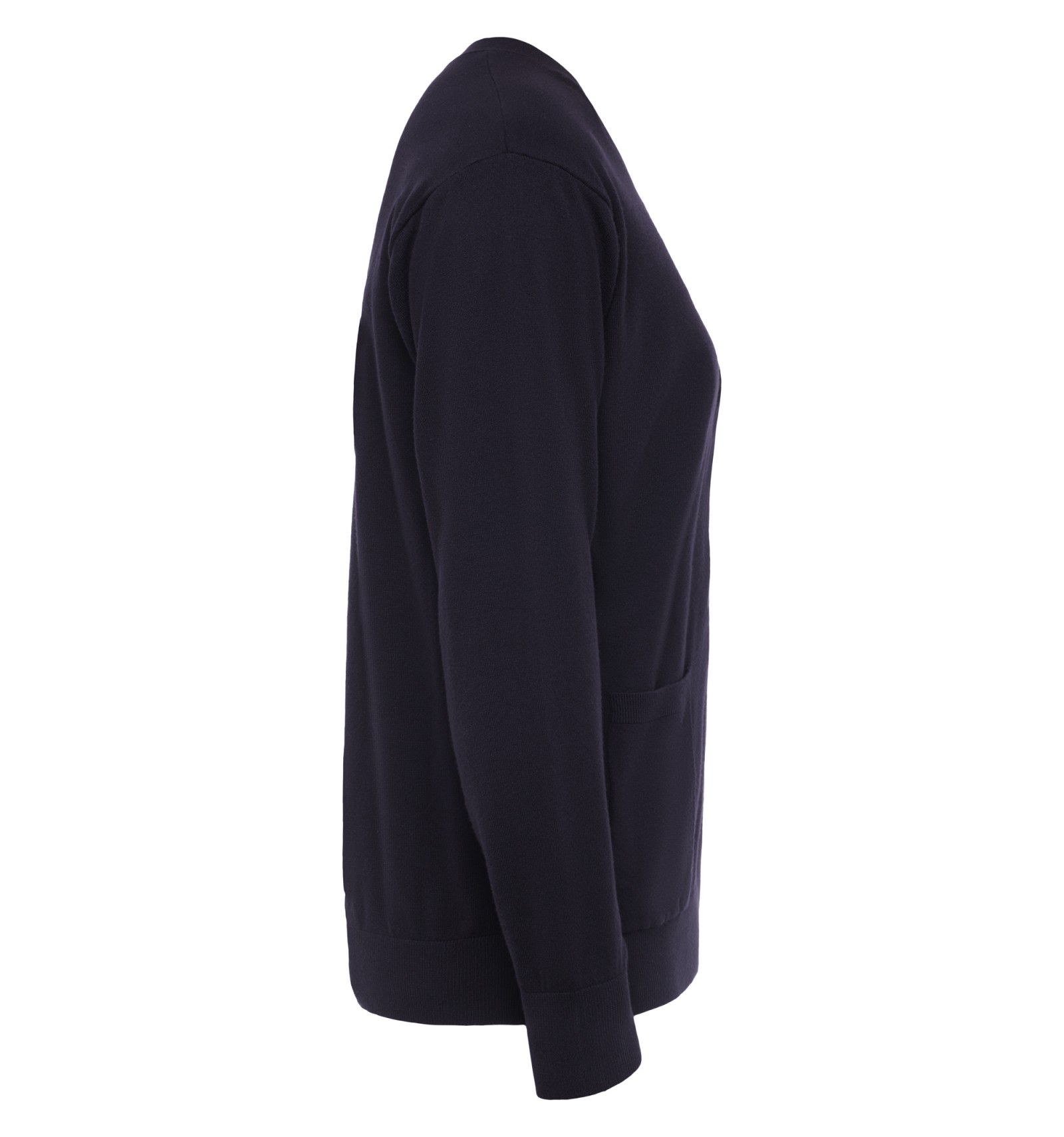 Jacheta cu guler cu anchior. Material de punct fin. Închidere pe mijloc cu cinci nasturi de aceeasi culoare. Doua buzunare aplicate. Talie si mansete în canalé.