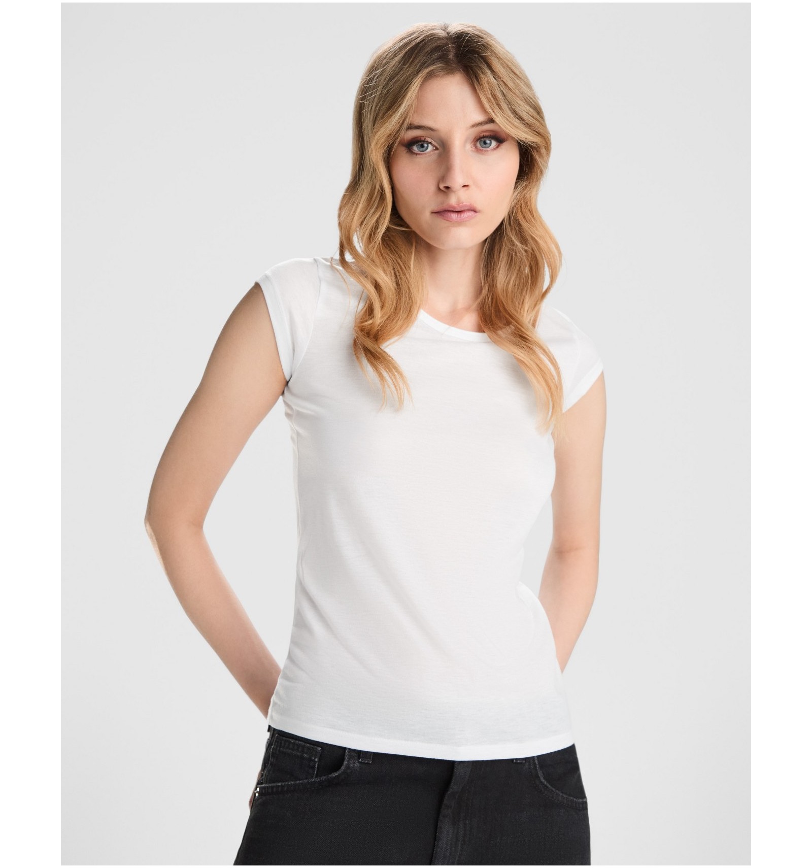 Tricou cambrat cu mânecă scurtă și guler rotund cu garnitură din același material. Are cusături laterale. Fabricat din poliester însă de tact bumbac