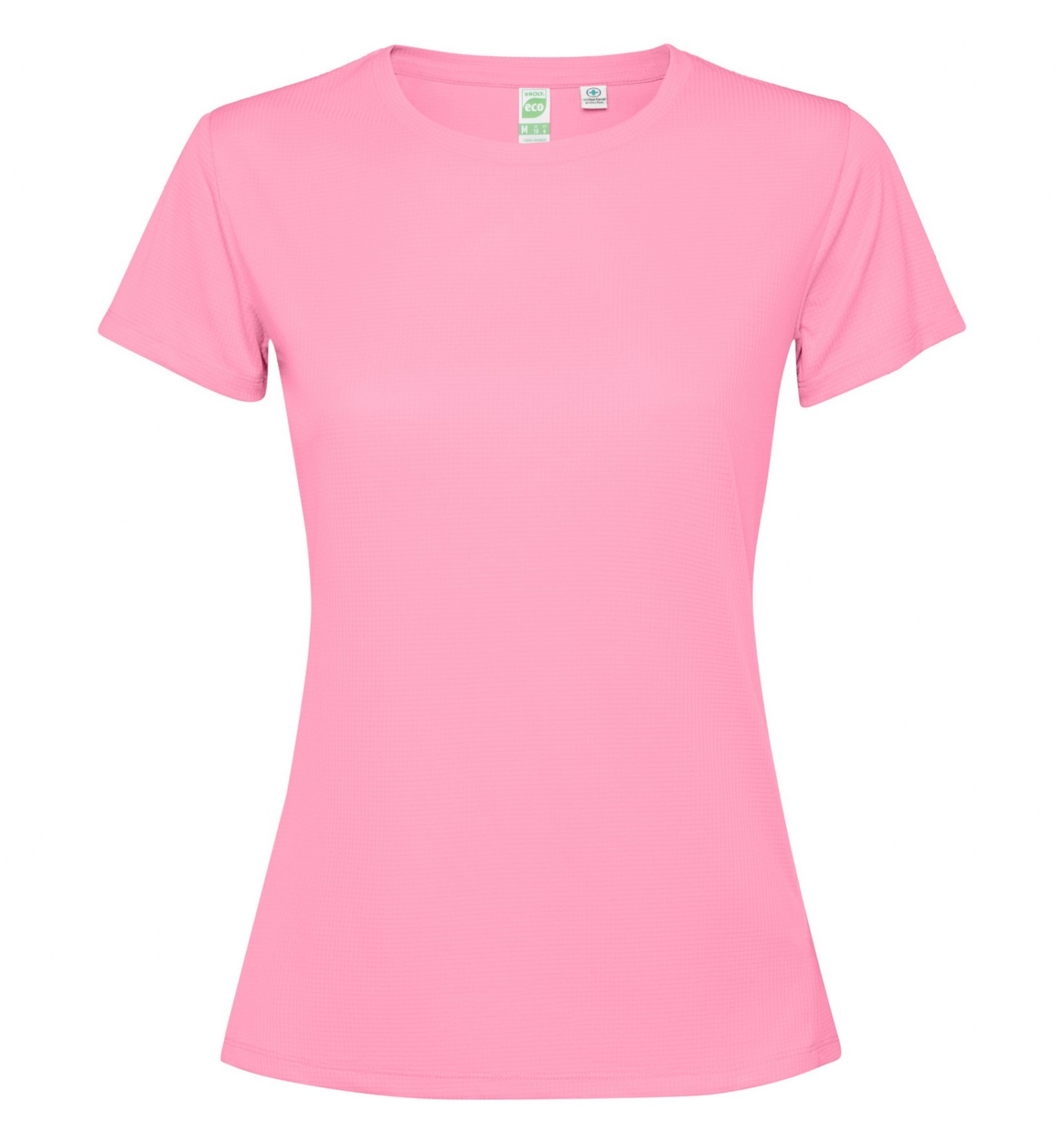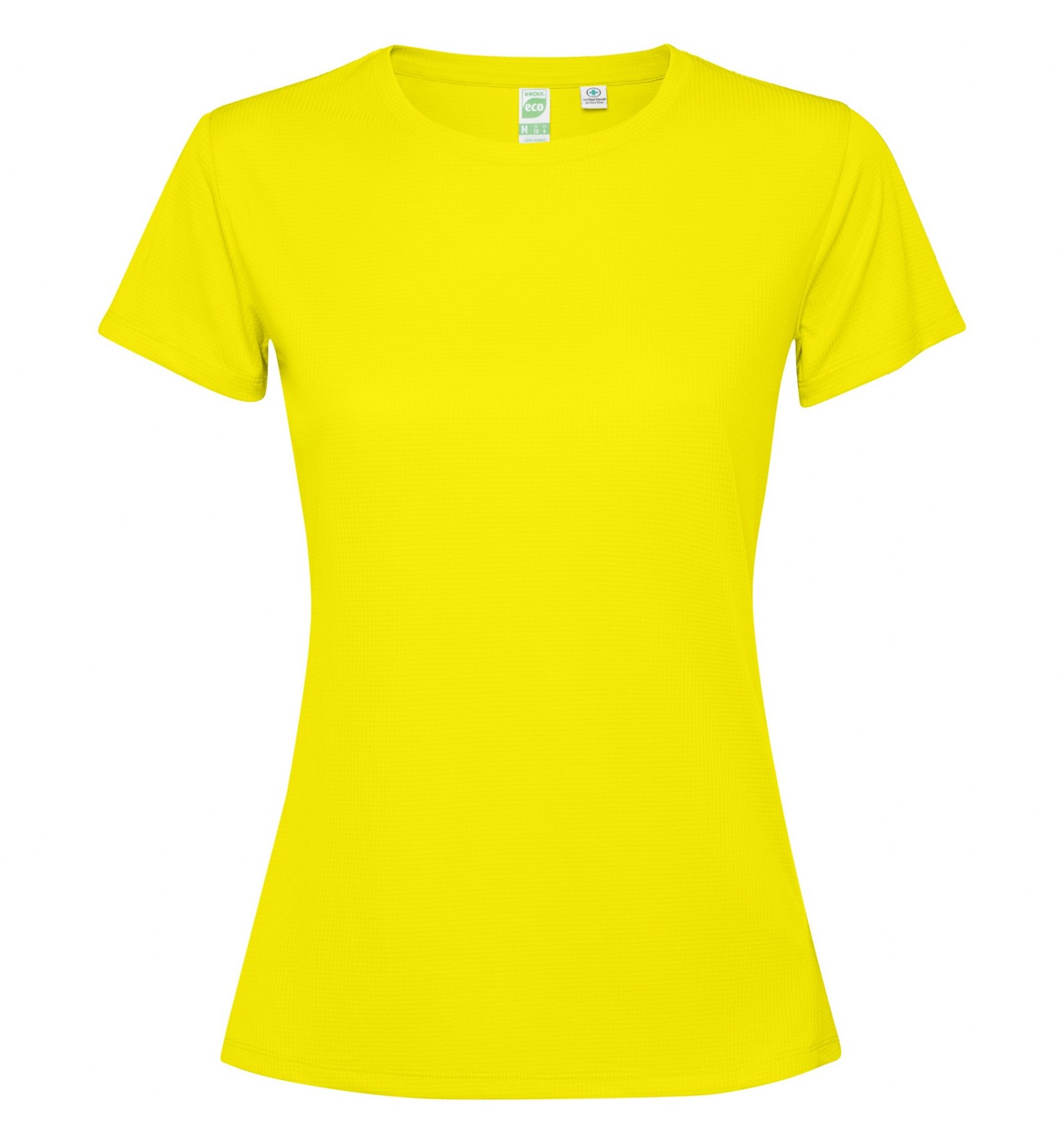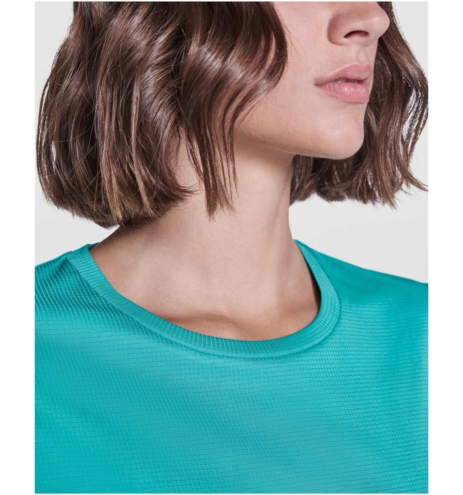 Tricou tehnic cambrat de damă cu mânecă scurtă. Guler cu cusături în aceeași culoare.