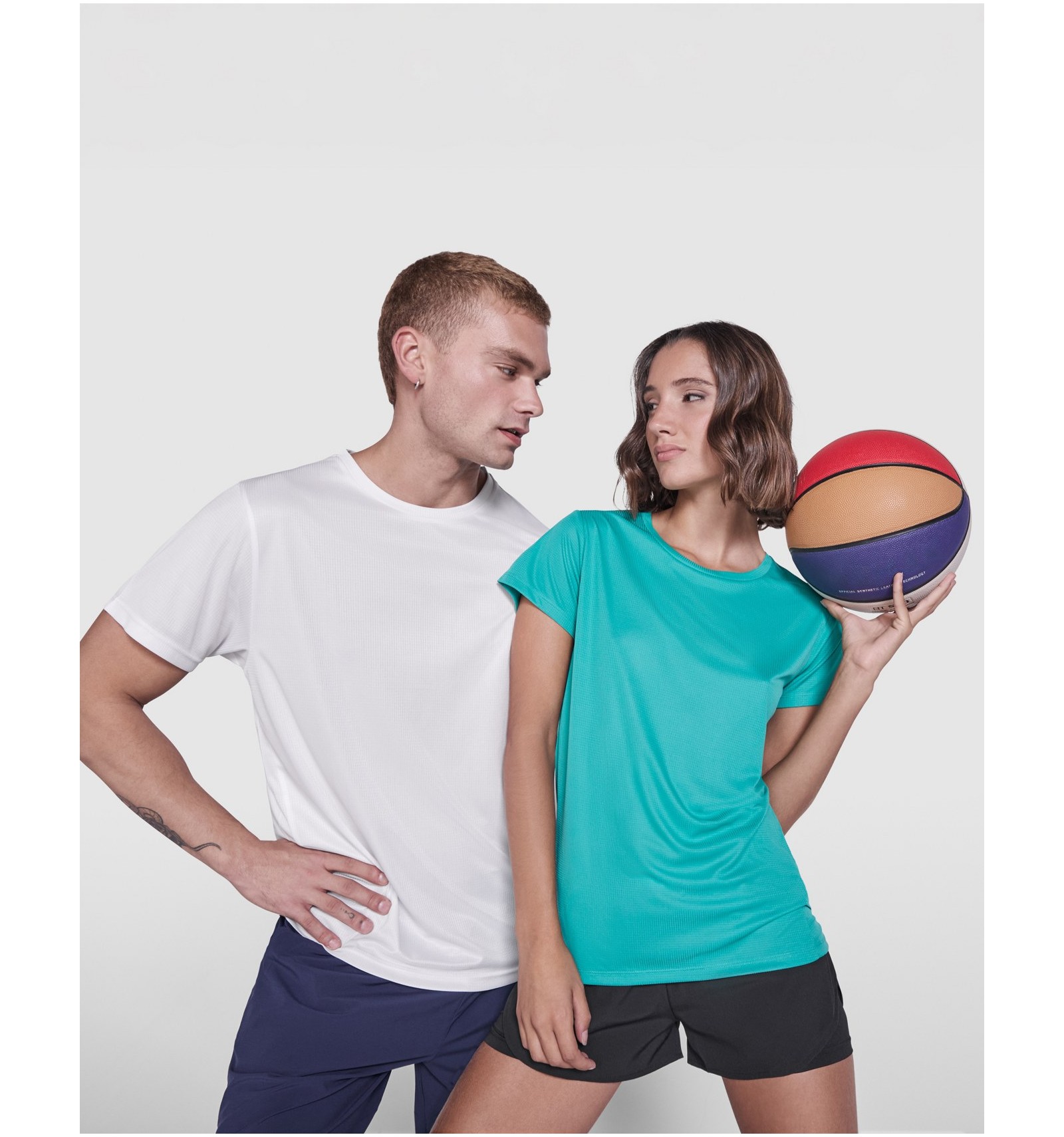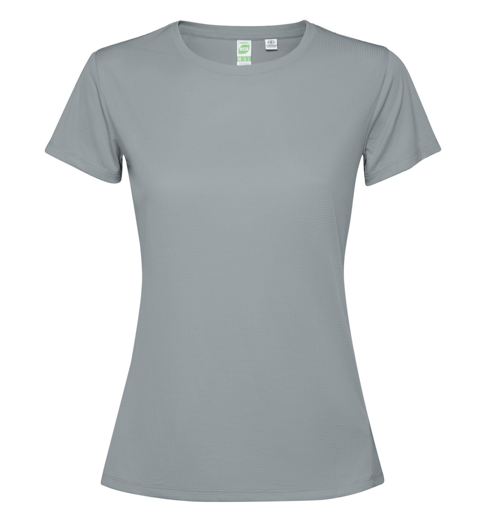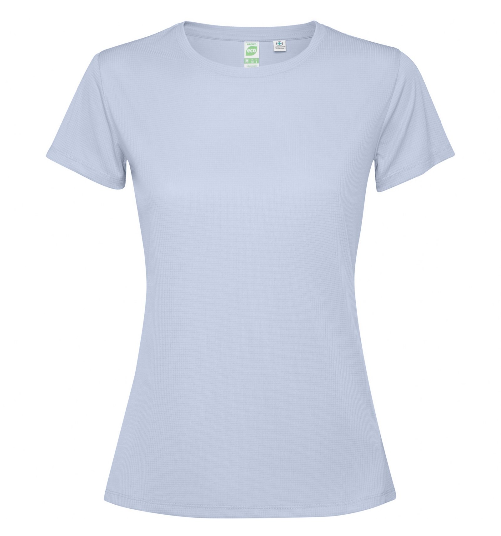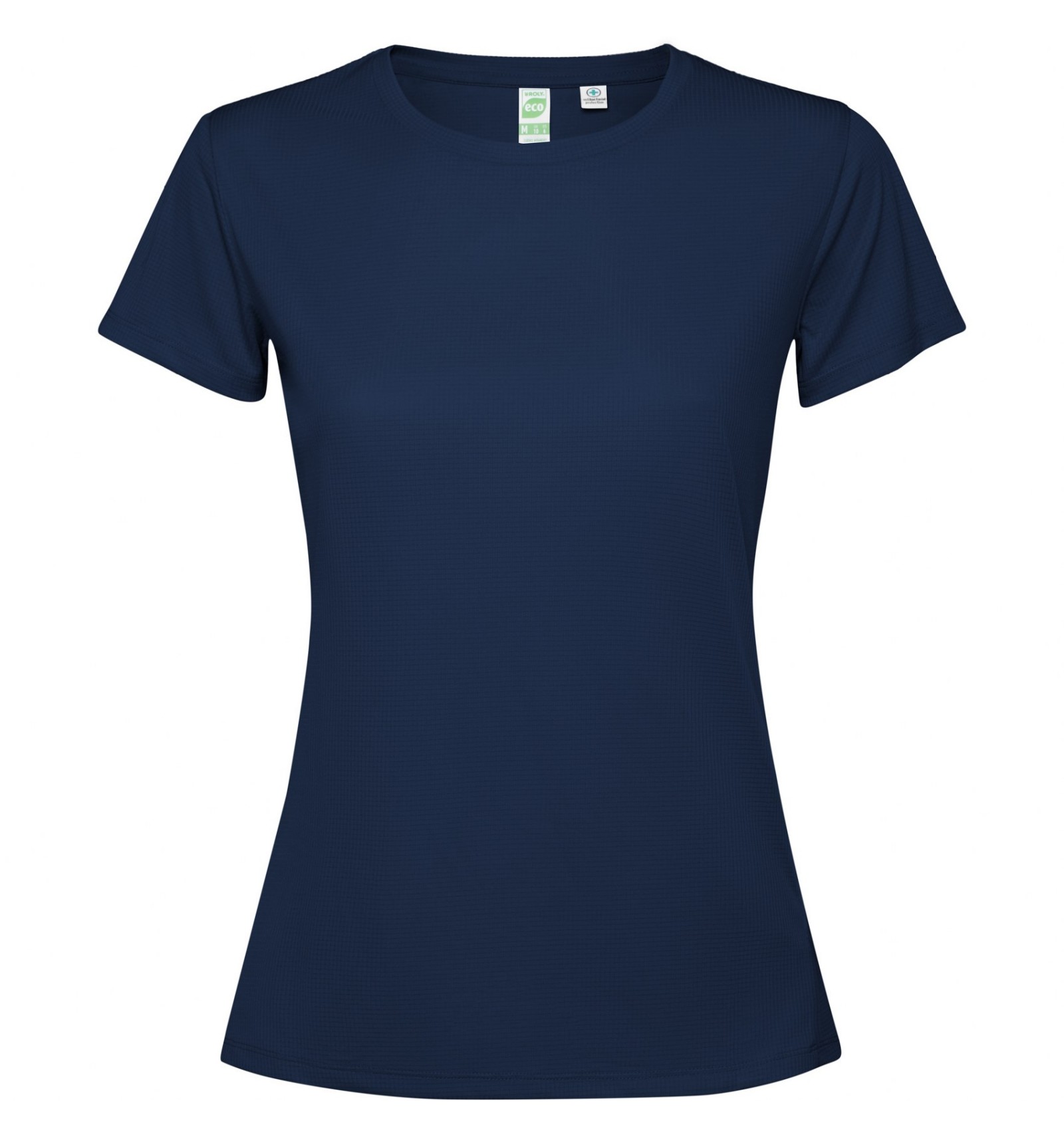 Tricou tehnic cambrat de damă cu mânecă scurtă. Guler cu cusături în aceeași culoare.