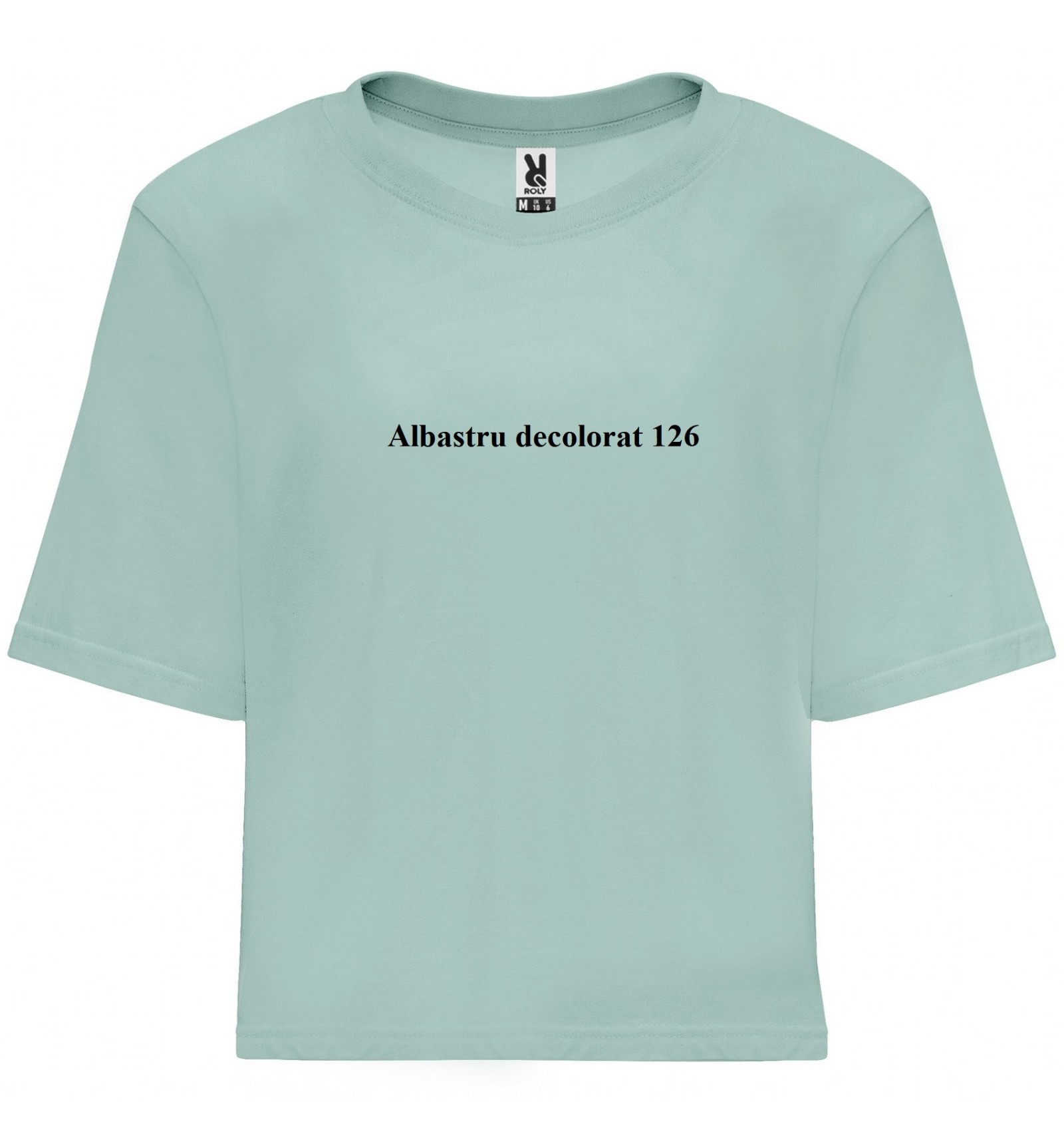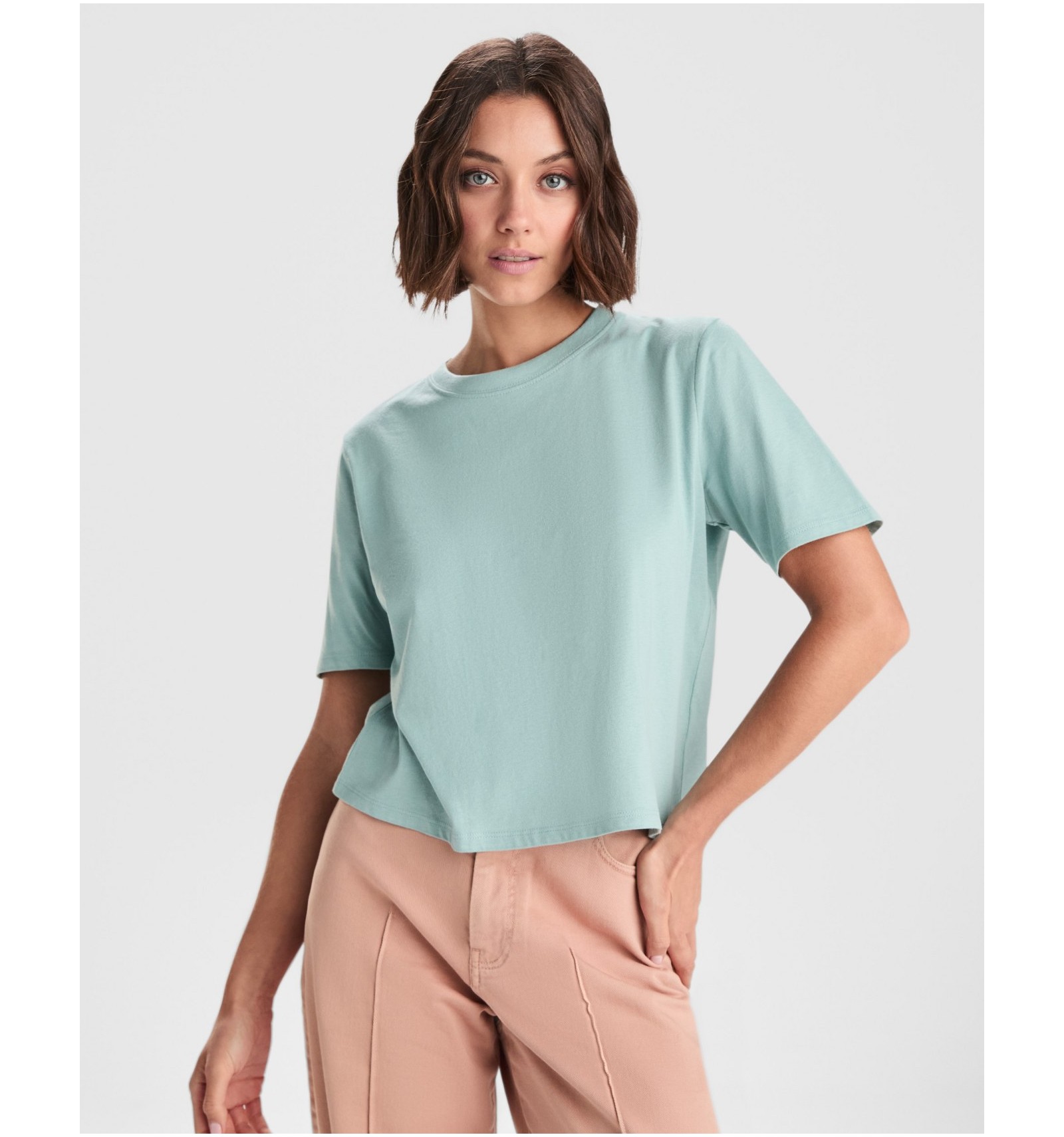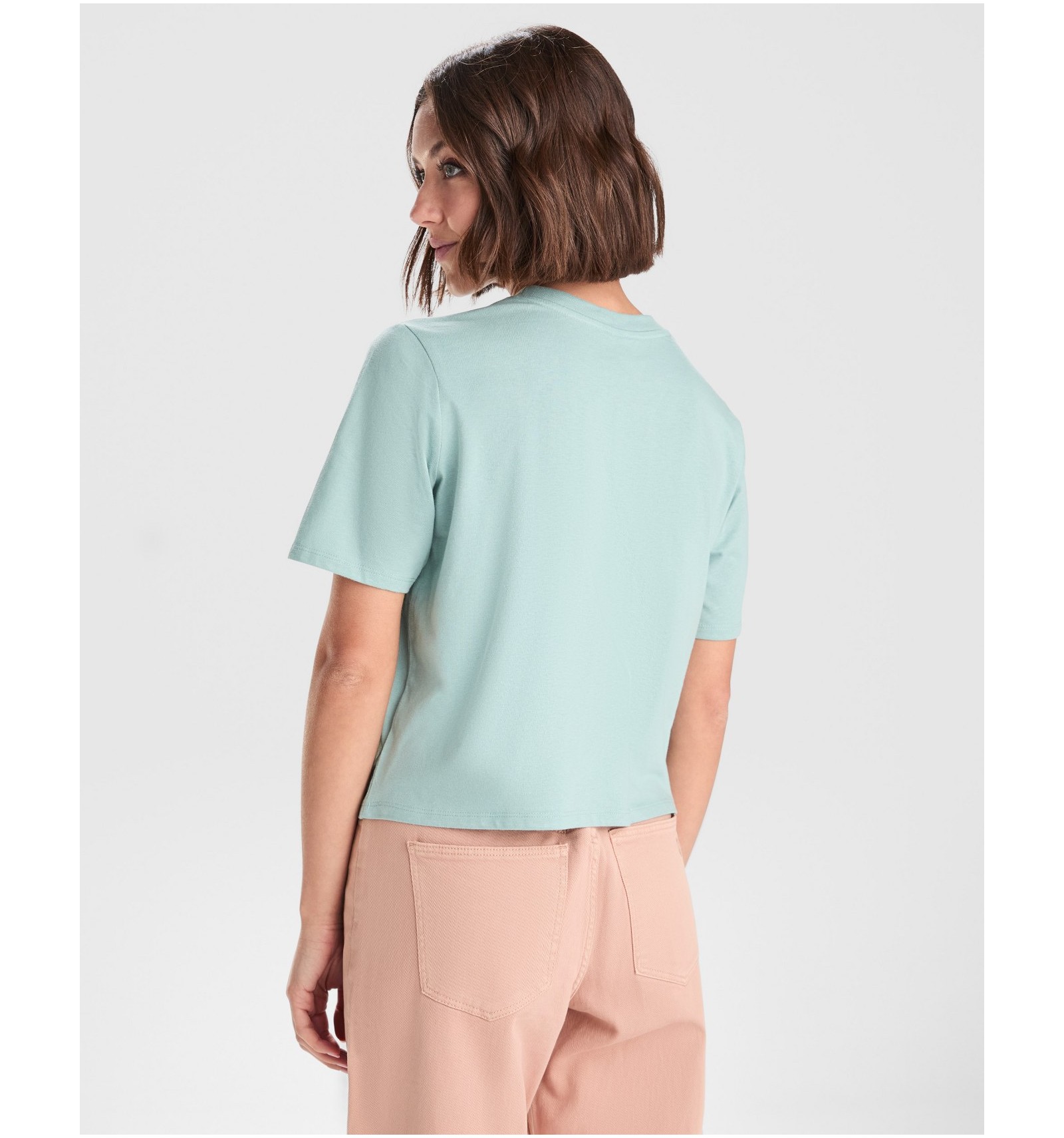 Tricou larg de damă cu mânecă scurtă. Guler rotund cu bordură lată în canalé 1x1. Bandă întărită pentru acoperirea cusăturilor de aceeași culoare.