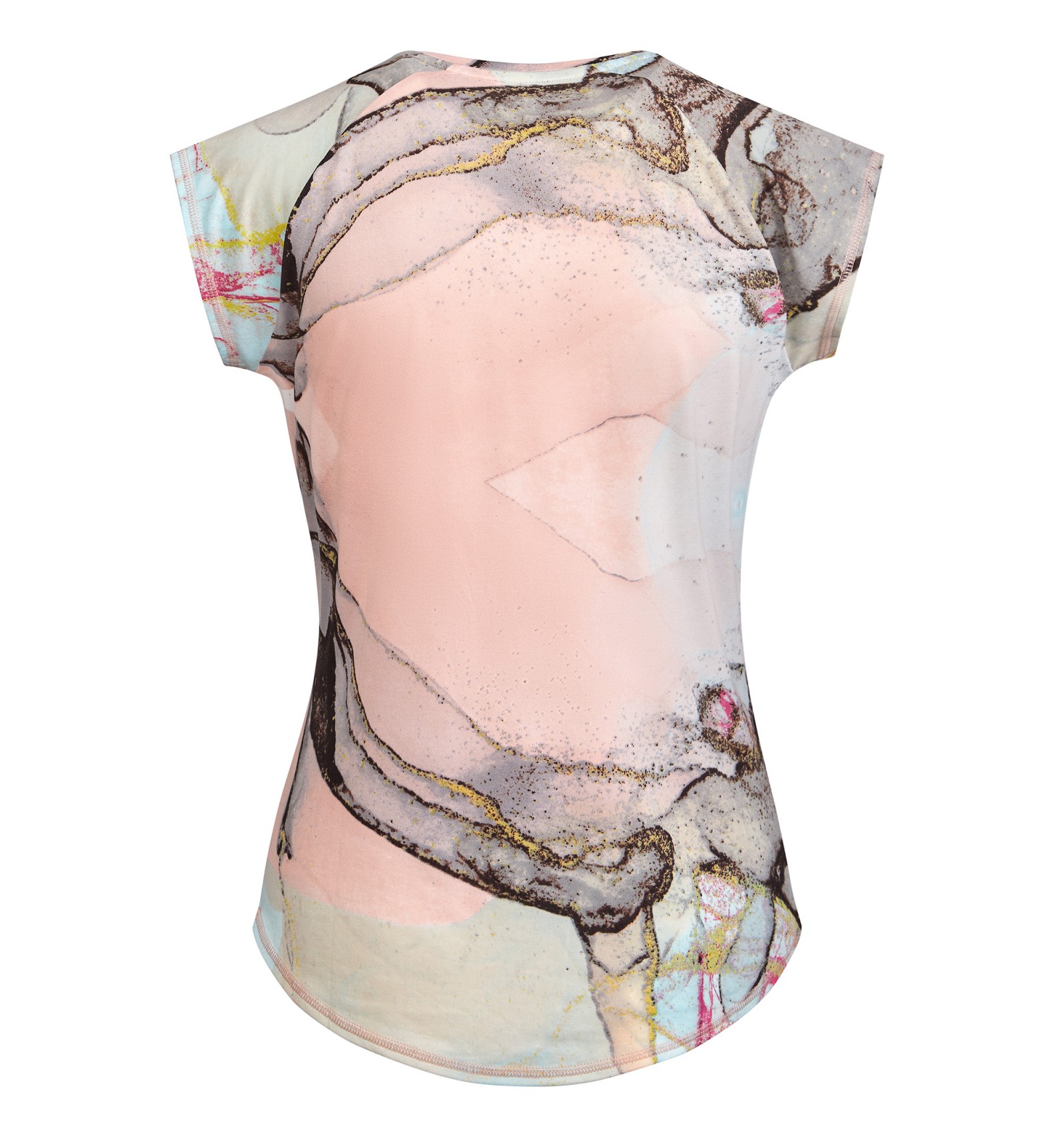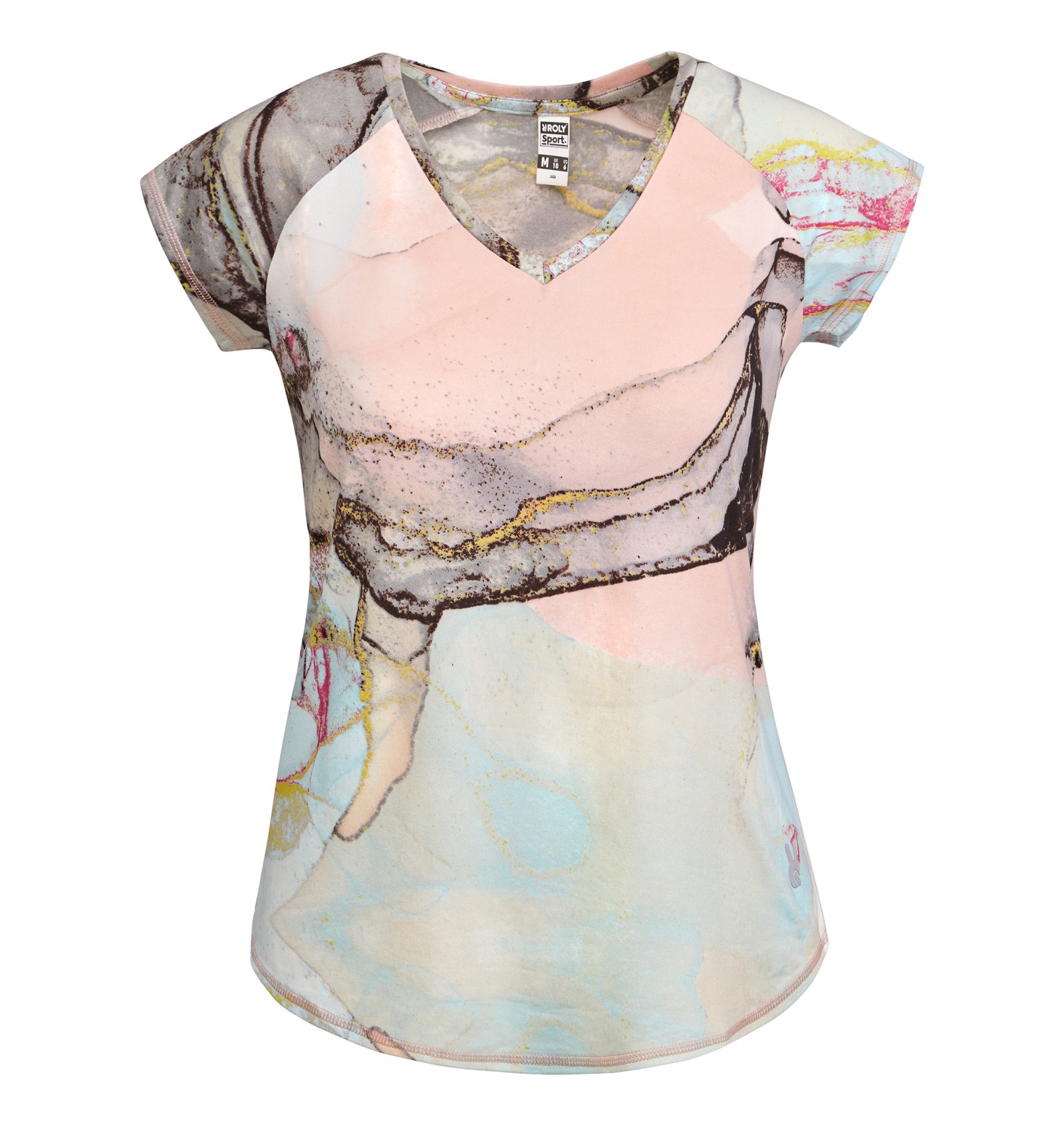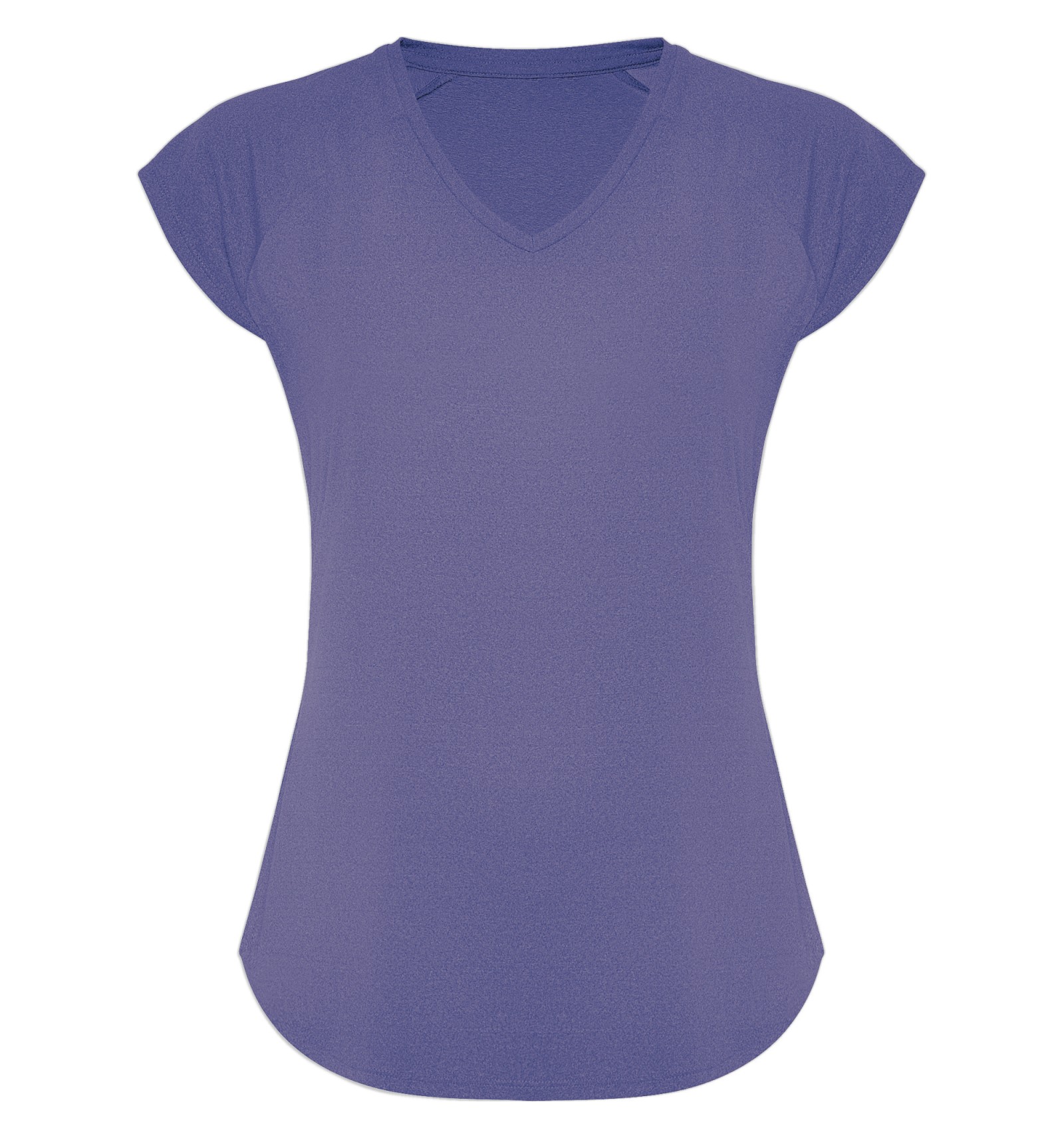 Tricou tehnic multisport și mâneci raglan. Decolteu în V. Țesătură din poliester cu atingere de bumbac. Croială cambrată. Tiv rotund. Cusături overlock asortate pe tiv și mâneci.