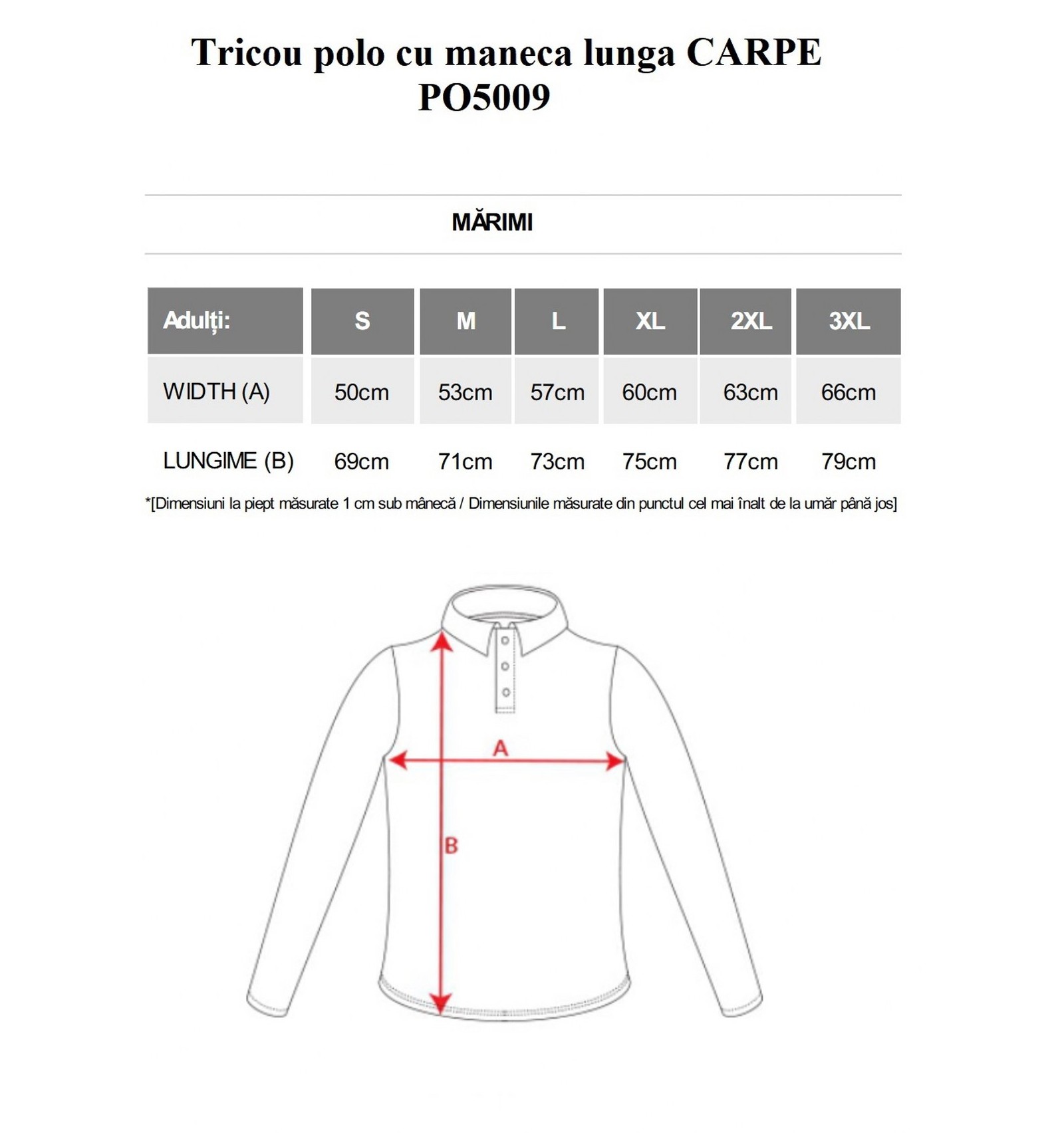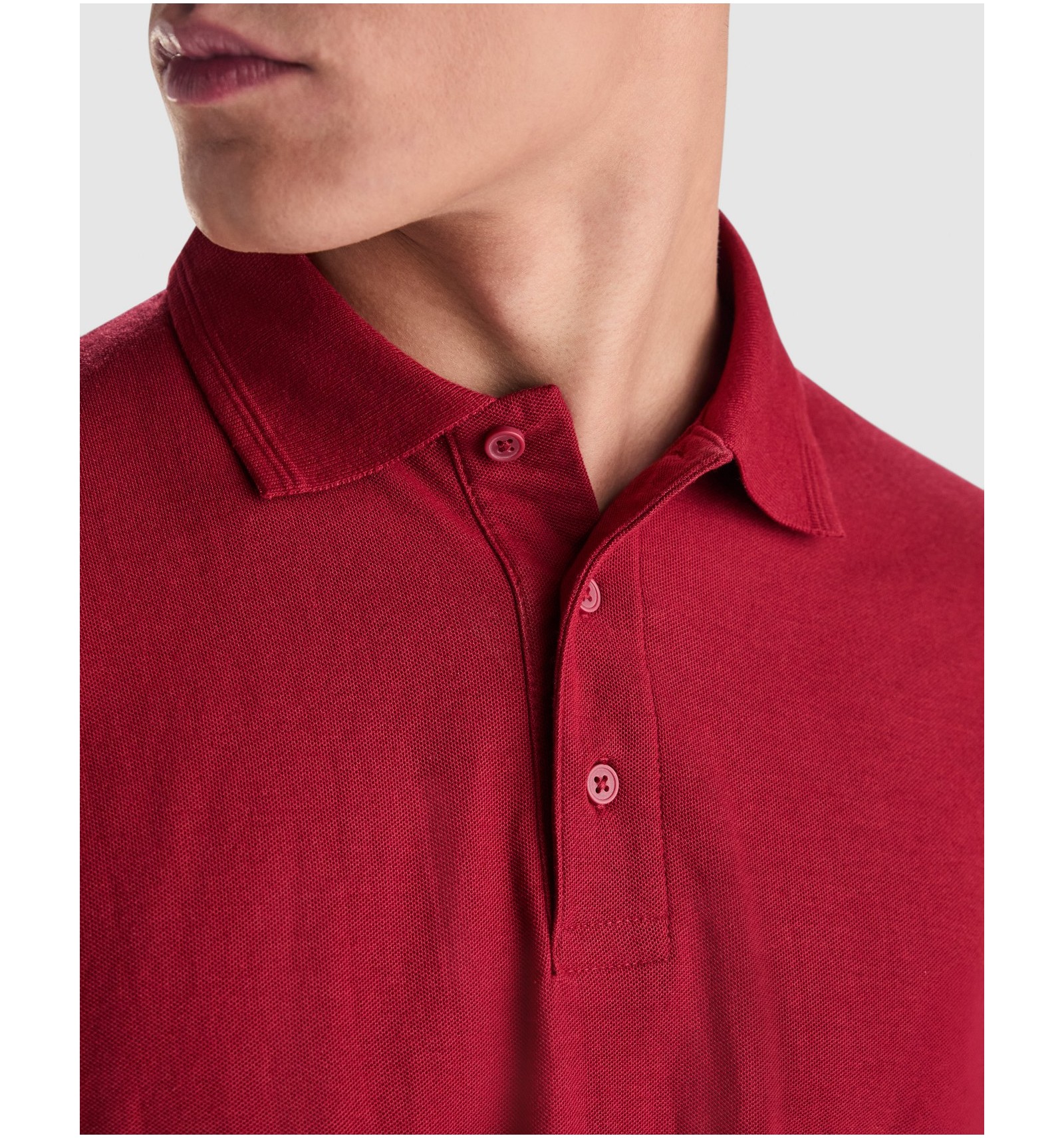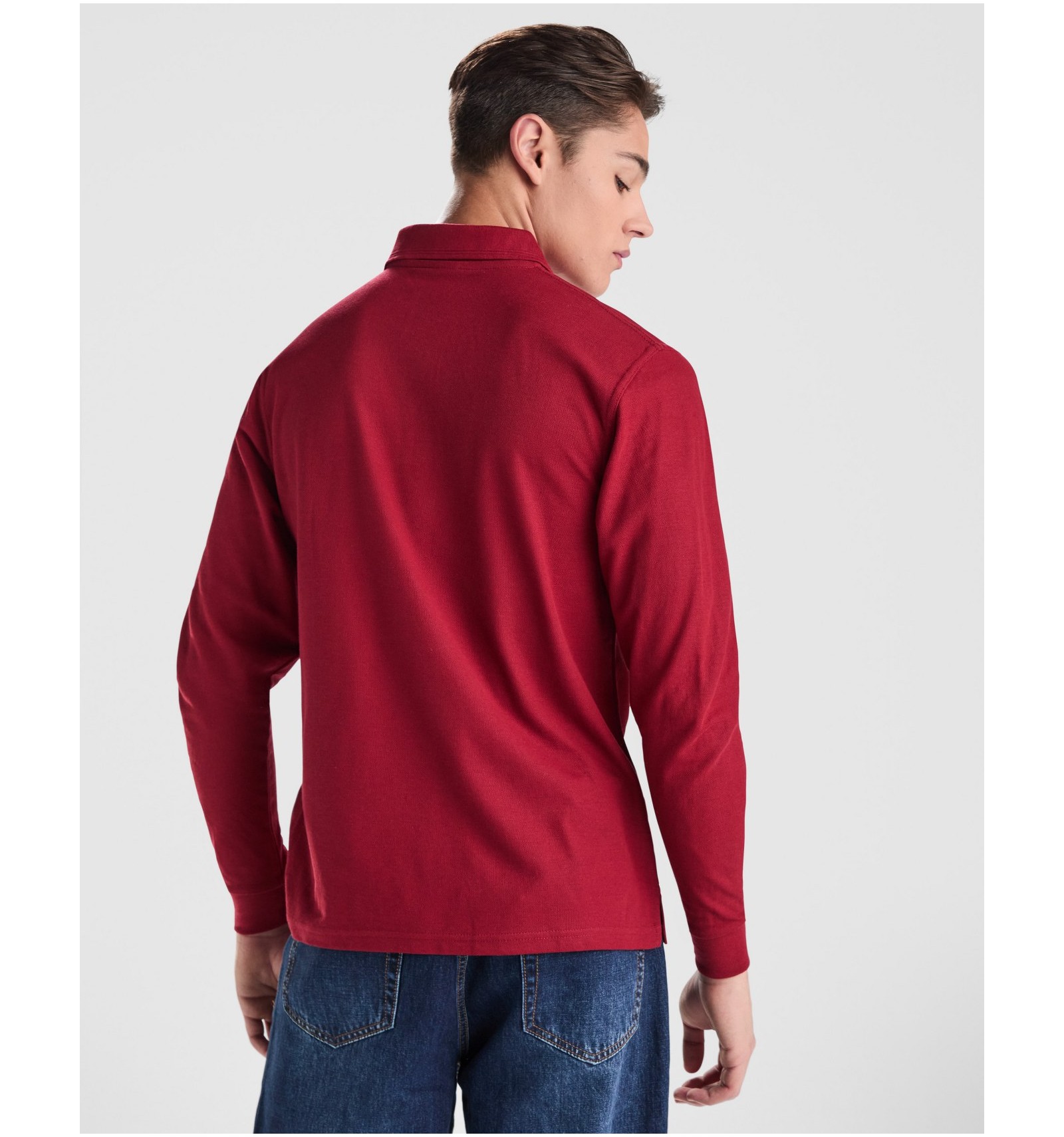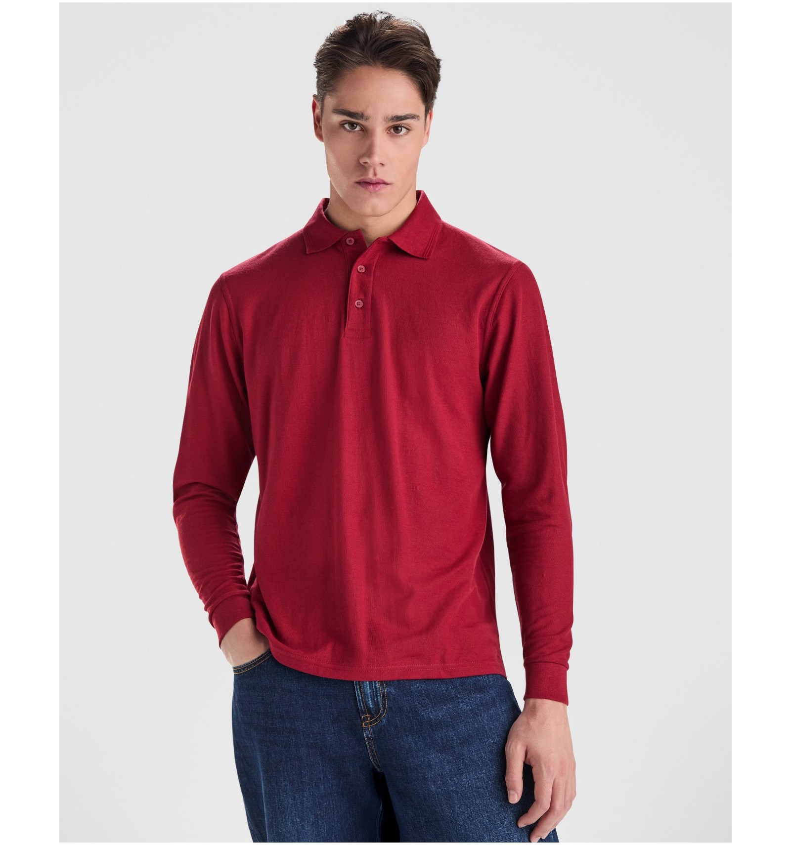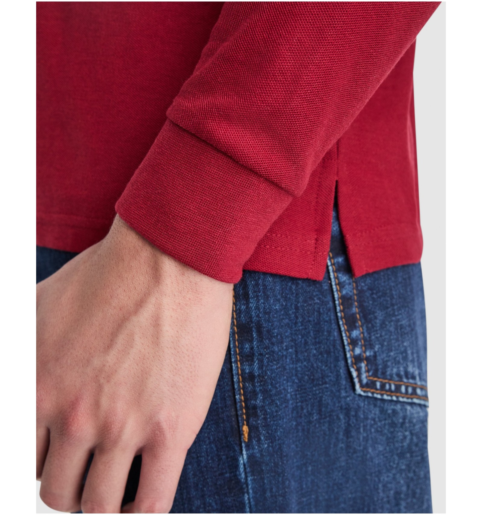 Tricou polo cu mânecă lungă, guler și manșete canalate 1x1 cu elastan și bandă întărită pentru acoperirea cusăturii la guler. Fantă cu 3 nasturi. Șlițuri laterale.