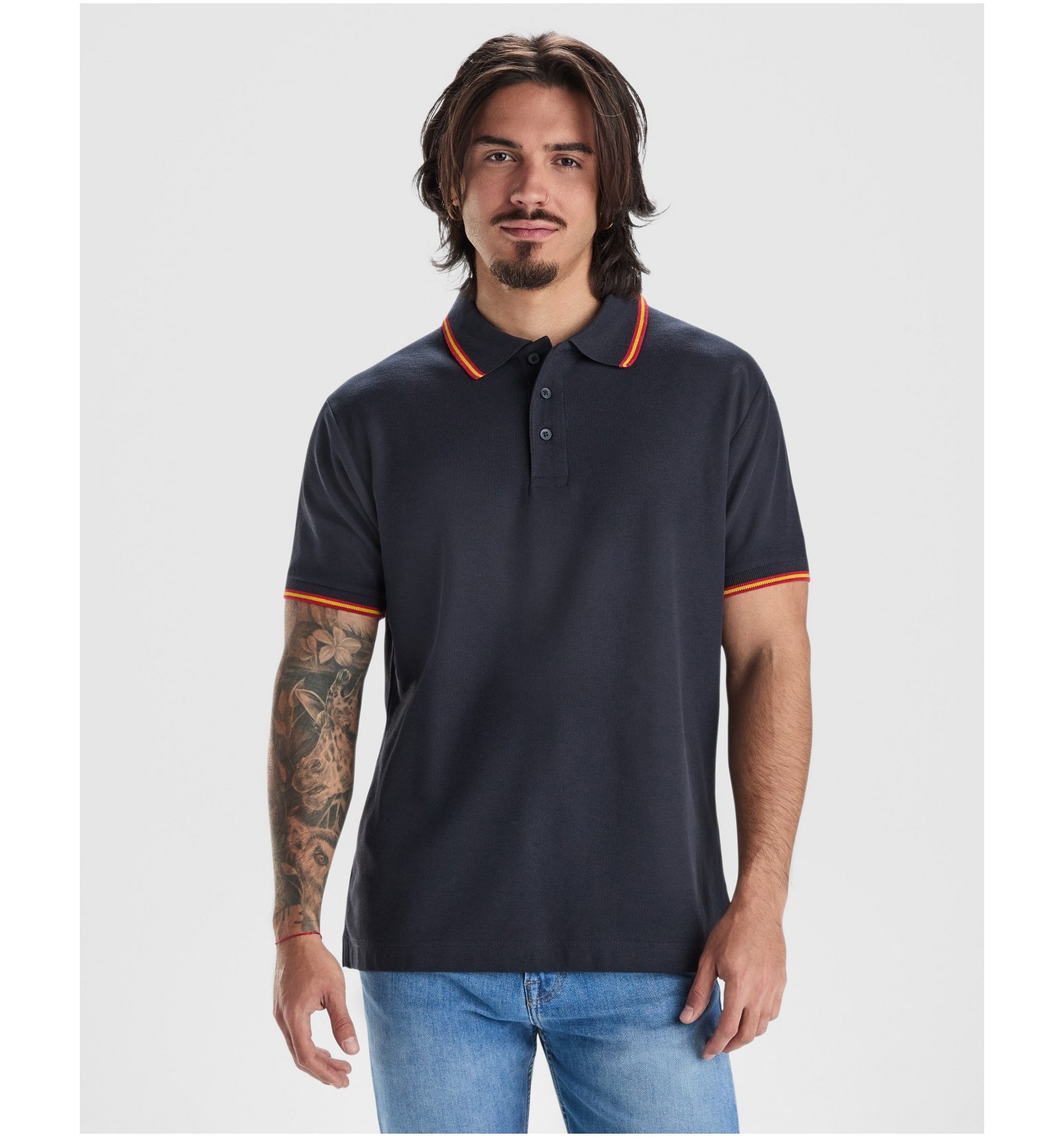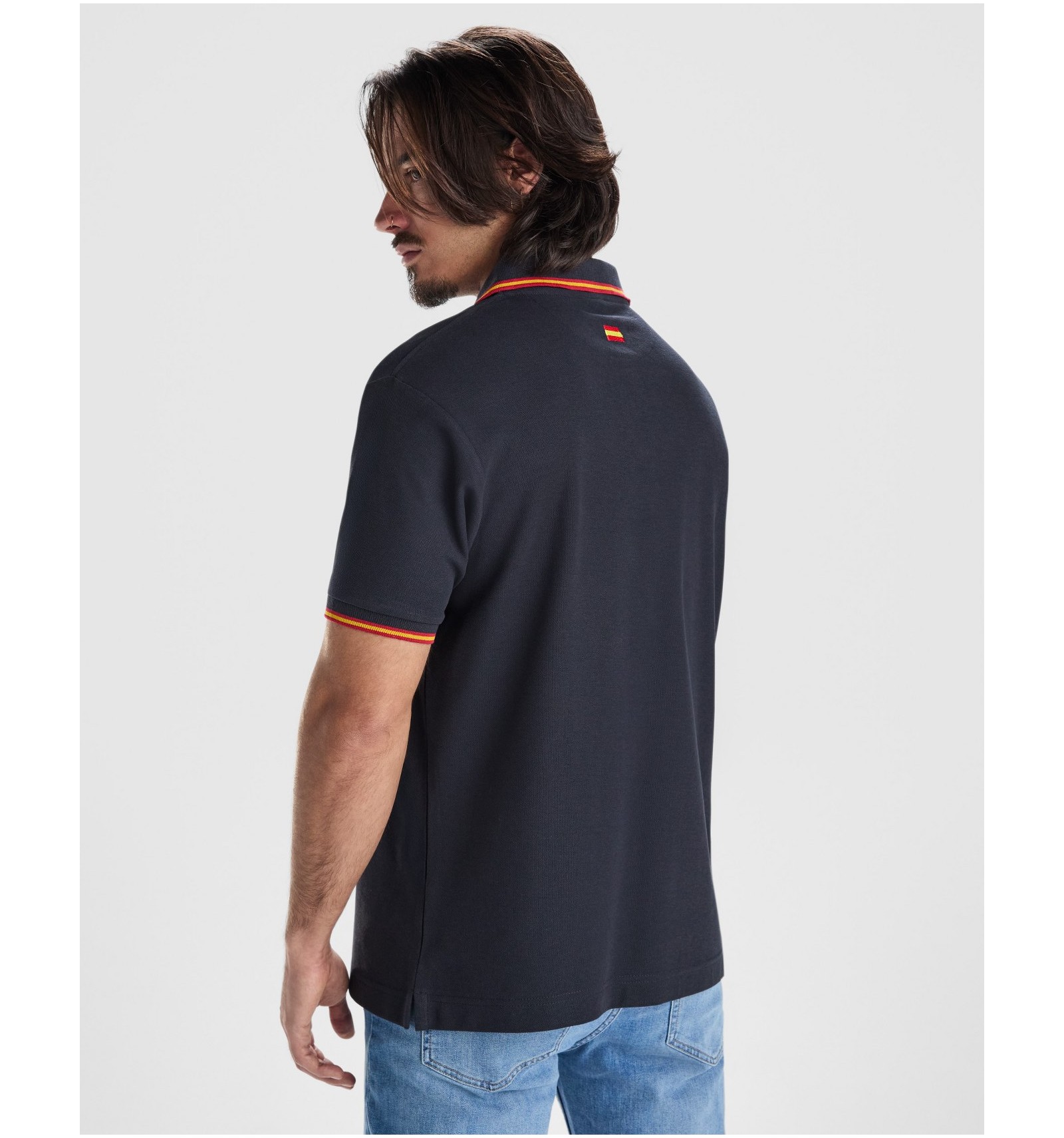 Tricou polo cu mânecă scurtă. Guler și manșete jackard cu tapetă cu trei nasturi. Bandă întărită pentru acoperirea cusăturilor la guler. Ornamental steag brodat la spate.